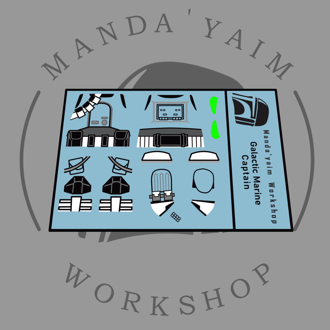 Decals designed and manufactured by Manda'yaim Workshop. Made to be applyed on Lego minifigure body and Manda'yaim Workshop Galactic Marine helmet Dark Red Dome + Black Face Mask.