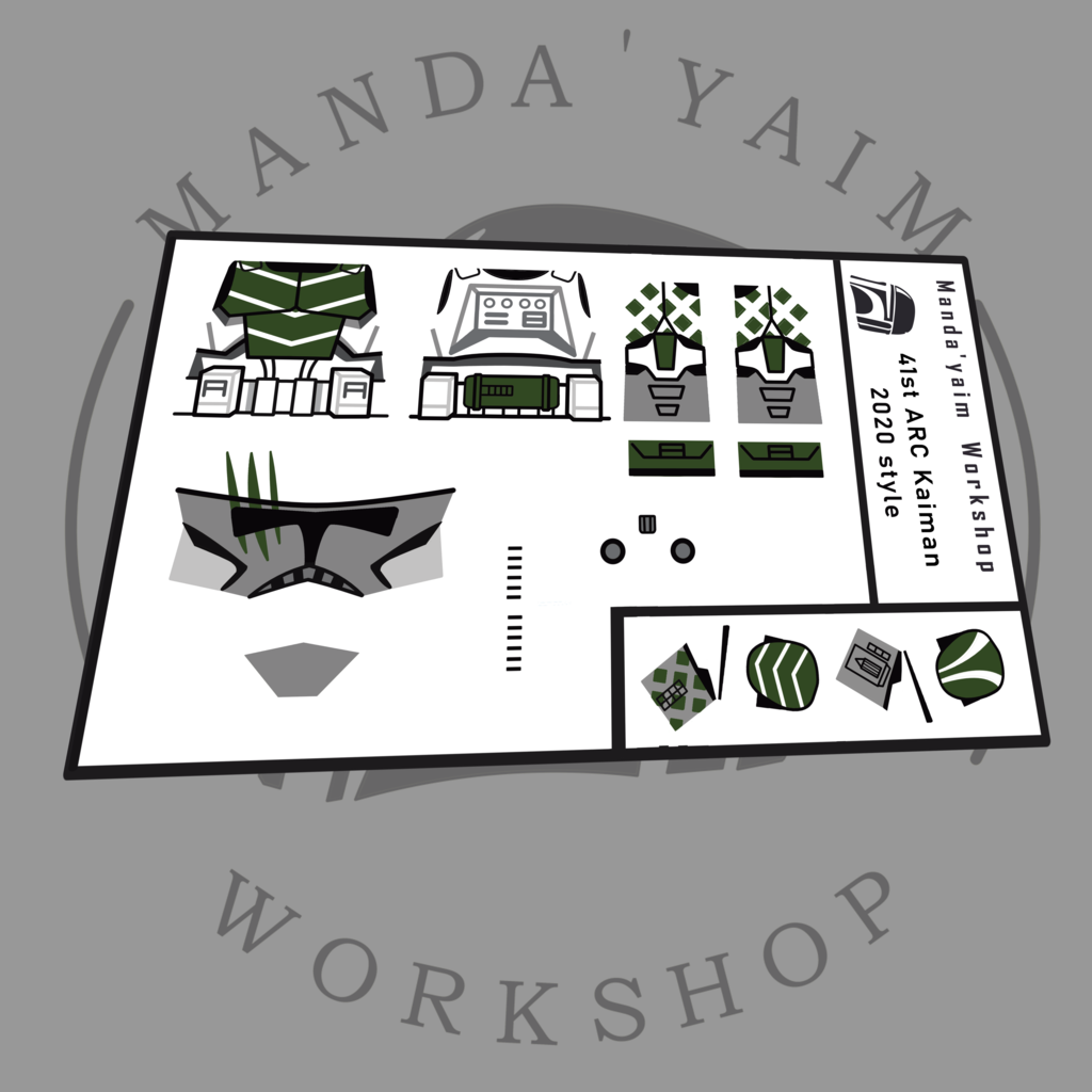 Kalkomanie zaprojektowane i wyprodukowane przez Manda'yaim Workshop. Przeznaczony do nałożenia na korpus minifigurki Lego i replikę/oficjalny hełm fazy 2.