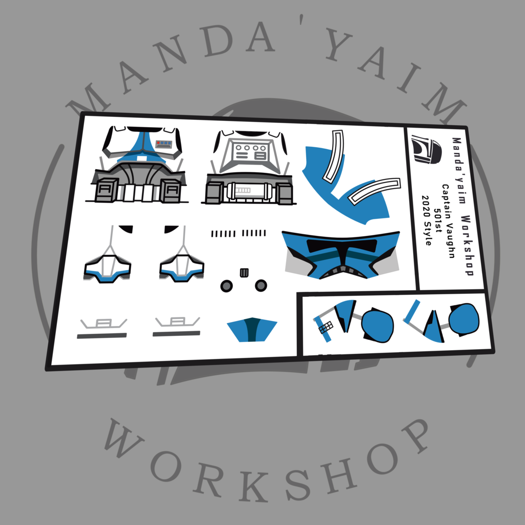 Kalkomanie zaprojektowane i wyprodukowane przez Manda'yaim Workshop. Przeznaczony do nałożenia na korpus minifigurki Lego i replikę/oficjalny hełm fazy 2.