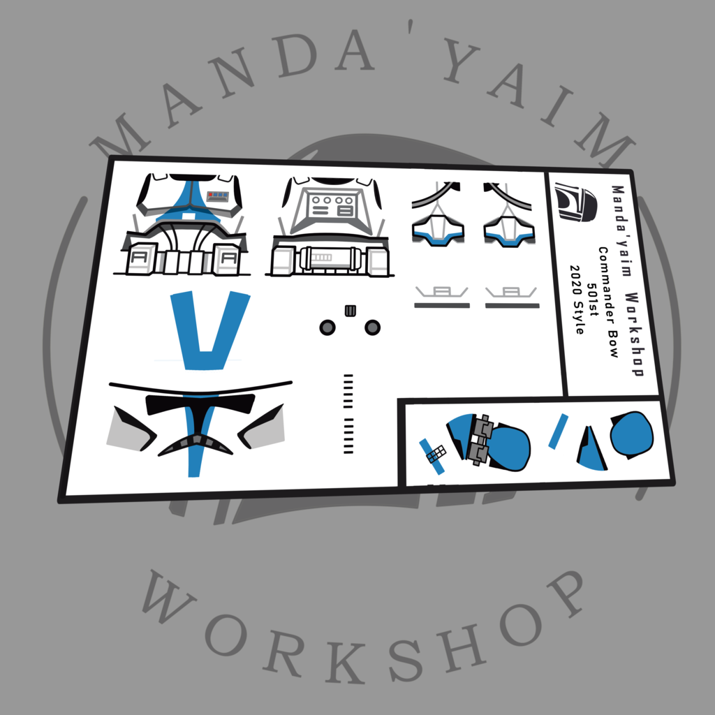 Kalkomanie zaprojektowane i wyprodukowane przez Manda'yaim Workshop. Przeznaczony do nałożenia na korpus minifigurki Lego i replikę/oficjalny hełm fazy 2.