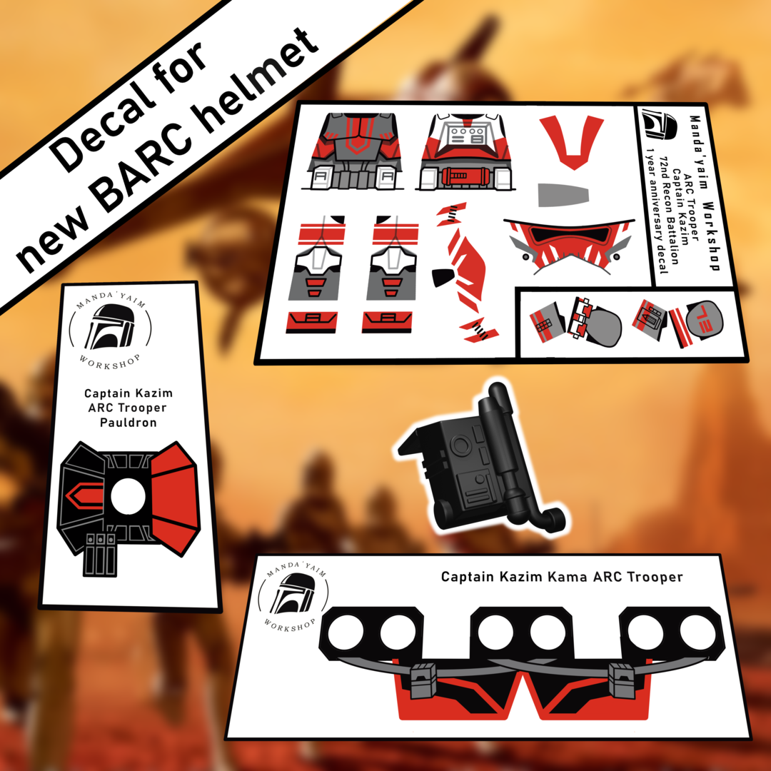 Decals designed and manufactured by Manda'yaim Workshop. Made to be applyed on Lego minifigure body and BARC helmet.