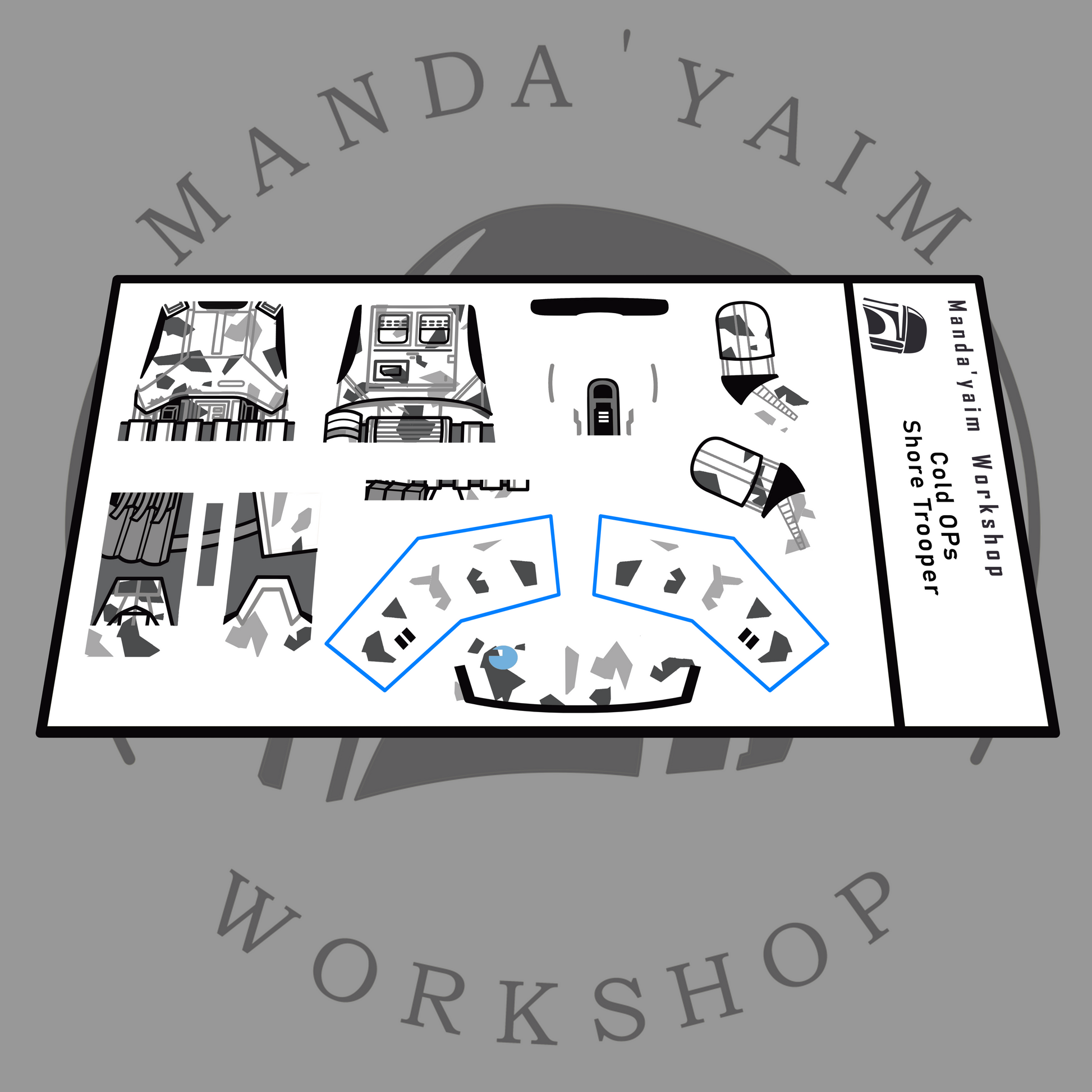 Decals designed and manufactured by Manda'yaim Workshop. Made to be applyed on Lego minifigure body and Shoretrooper helmet.