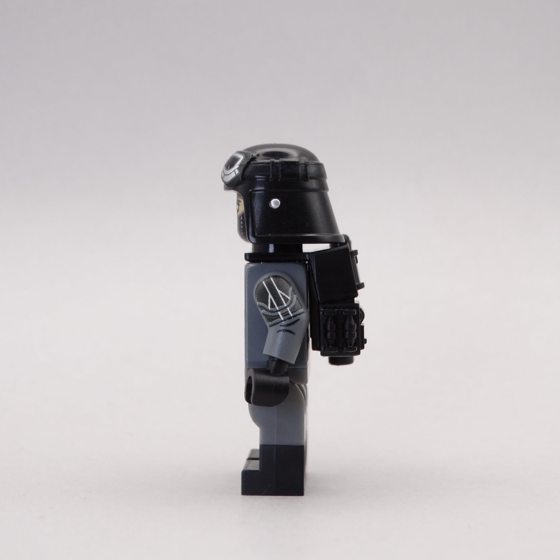 Minifigure UV printed on original body with decaled replica helmet.