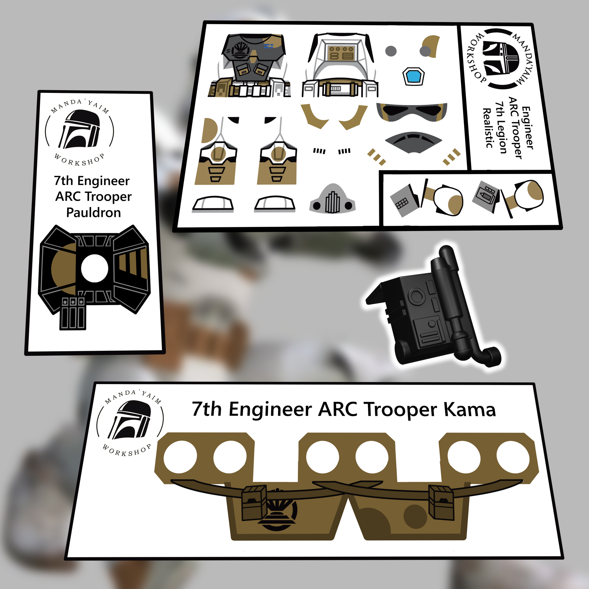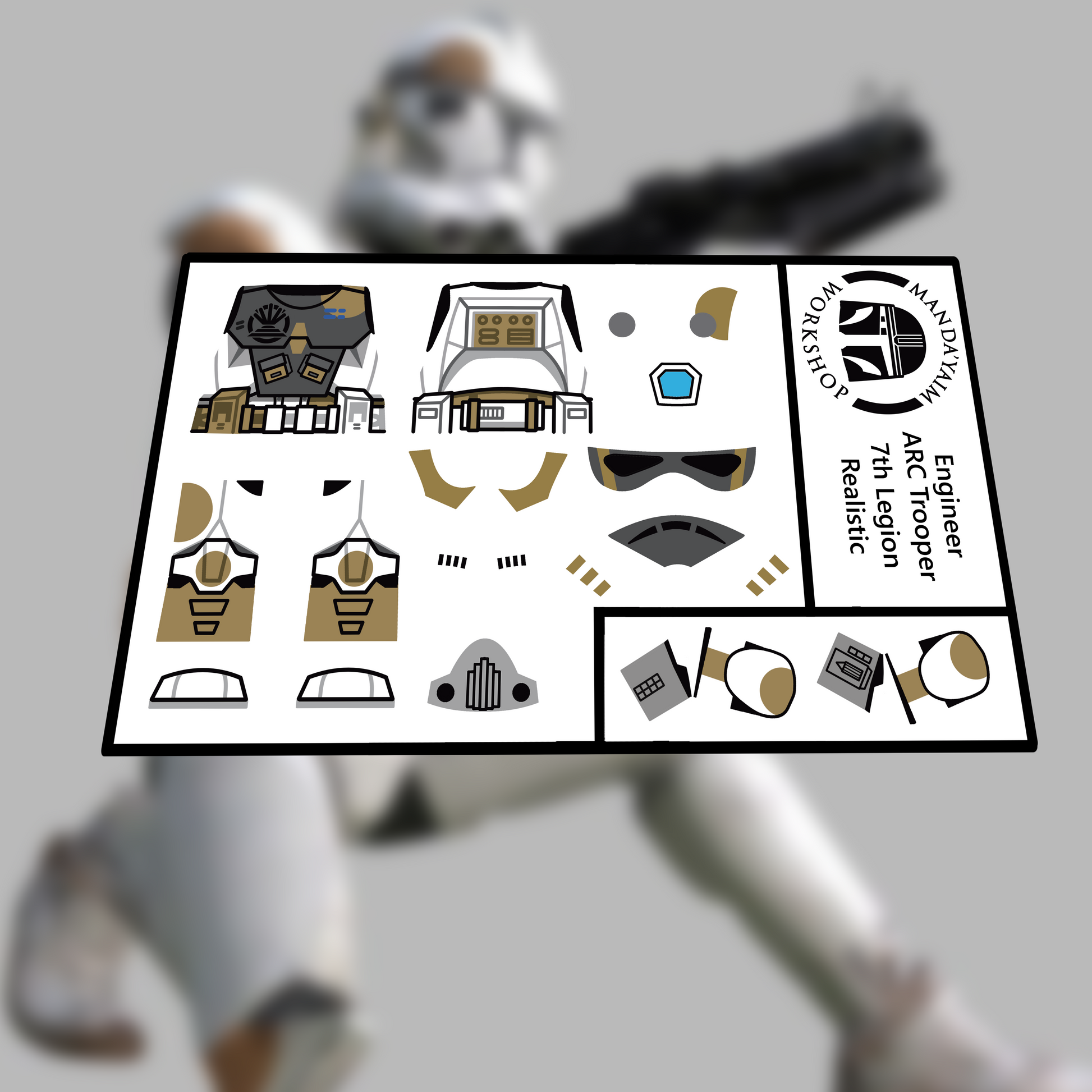 Decals designed and manufactured by Manda'yaim Workshop. Made to be applyed on Lego minifigure body and Engineer helmet.