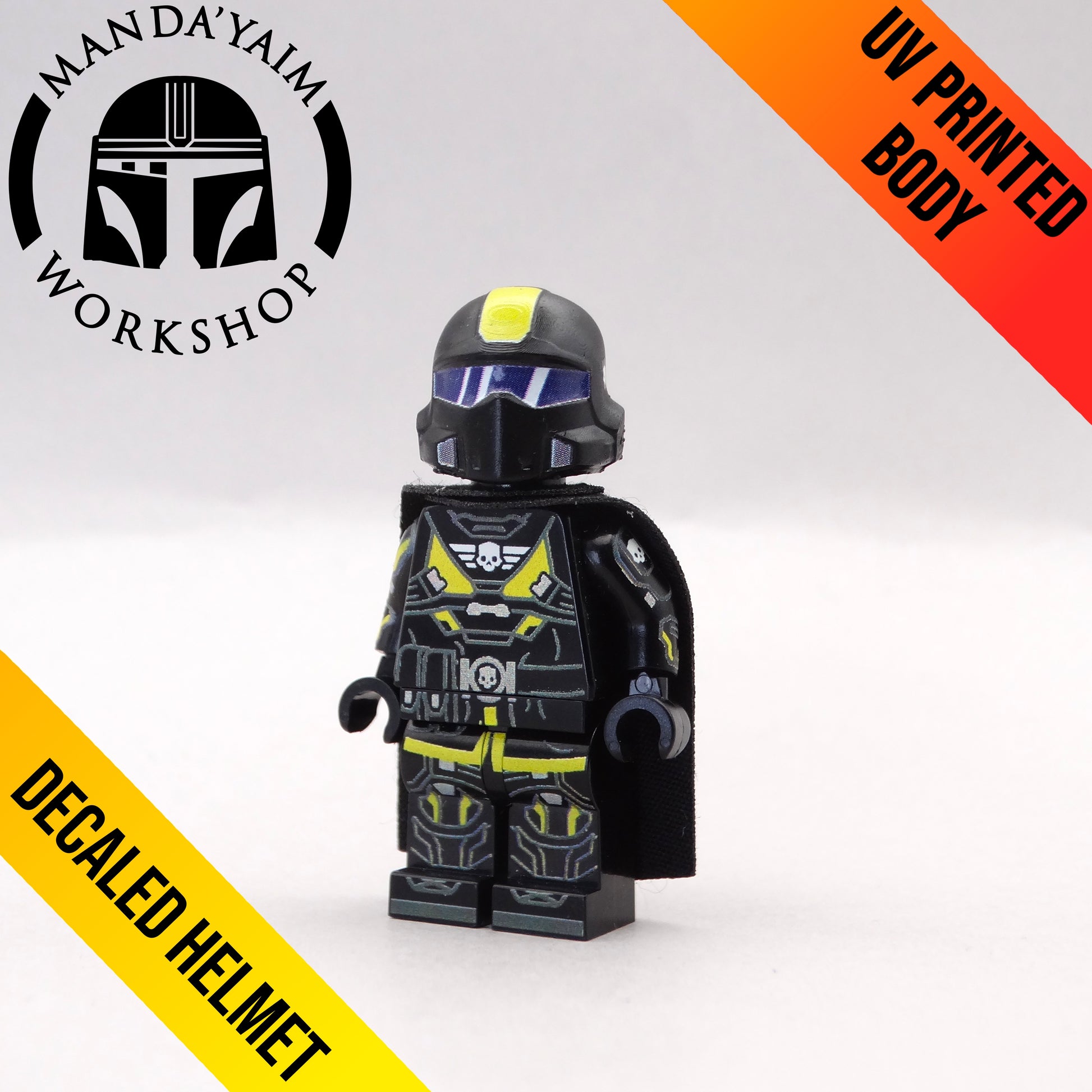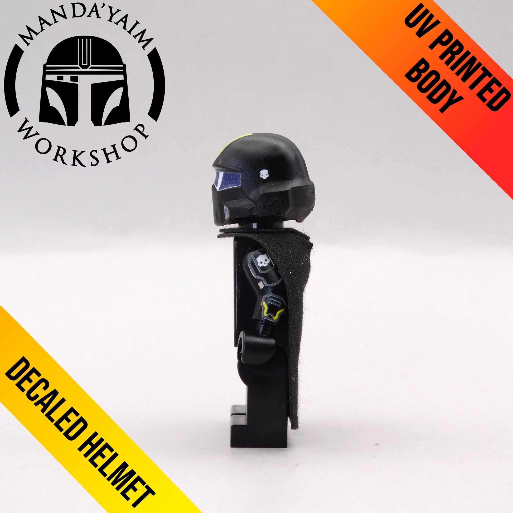 Minifigure UV printed on original body with decaled replica helmet.