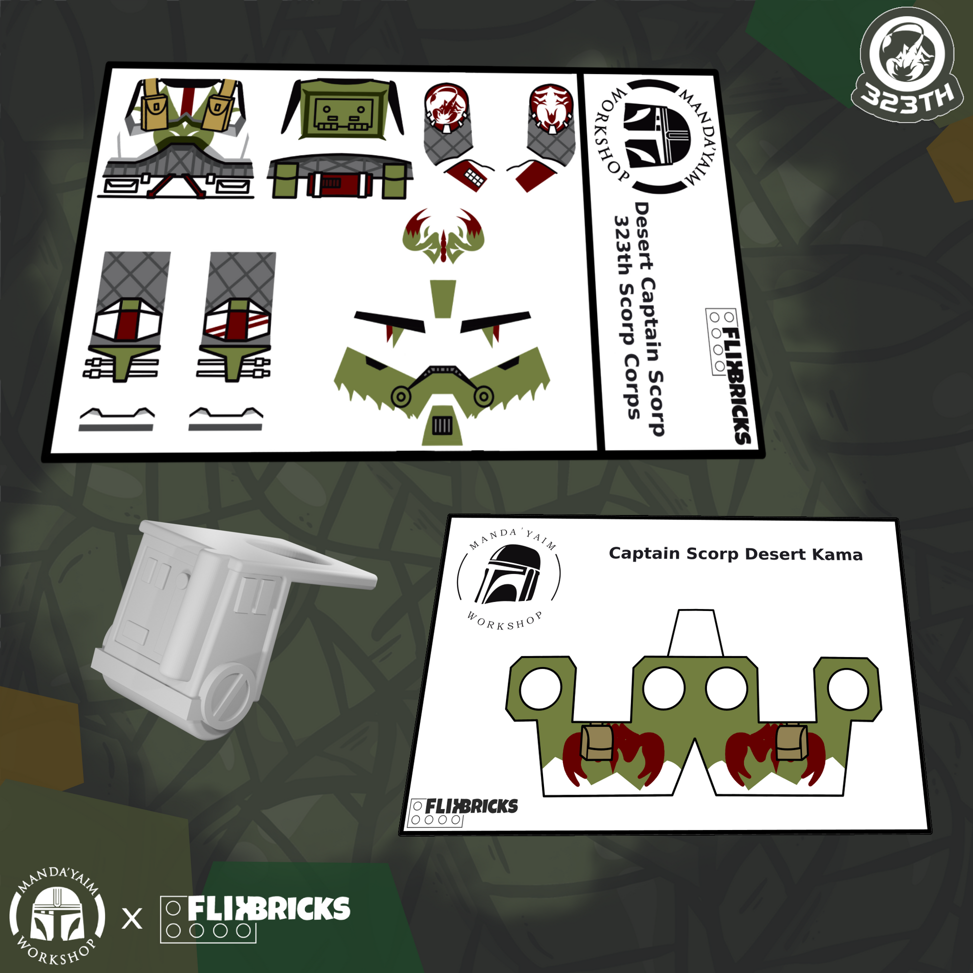 Decals designed and manufactured by Manda'yaim Workshop. Made to be applyed on Lego minifigure body and Manda'yaim Workshop Desert helmet.